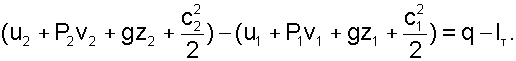 Полная удельная энергия потока в сечении 1 и 2 представляет сумму внутренней энергии вещества – u, кинетической энергии видимого движения – с2/2, потенциальной энергии относительно фиксированного нулевого уровня поверхности – gz, где g – ускорение свободного падения, а z – расстояние до фиксированного нулевого уровня поверхности, плюс величину работы проталкивания – Рv. Работа проталкивания – Рv является составляющей полной энергии потока, поскольку она совершается за счет внешнего воздействия (поршень перемещает газ в цилиндре при его поступлении через впускной клапан), т.е. для доставки килограмма вещества в данное сечение канала затрачивается внешняя работа – Рv. В свою очередь работа есть мера энергетического взаимодействия, поэтому, совершив над веществом работу проталкивания, энергия вещества увеличится на величину этой работы.