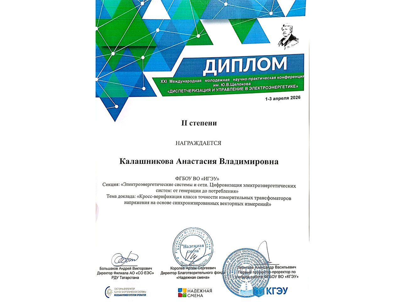 1-3 апреля в Казанском государственном энергетическом университете в рамках Международного электроэнергетического форума ЭНЕРГОПРОМ 2026 состоялась XXI Международная молодежная научно-практическая конференция «Диспетчеризация и управление в электроэнергетике».