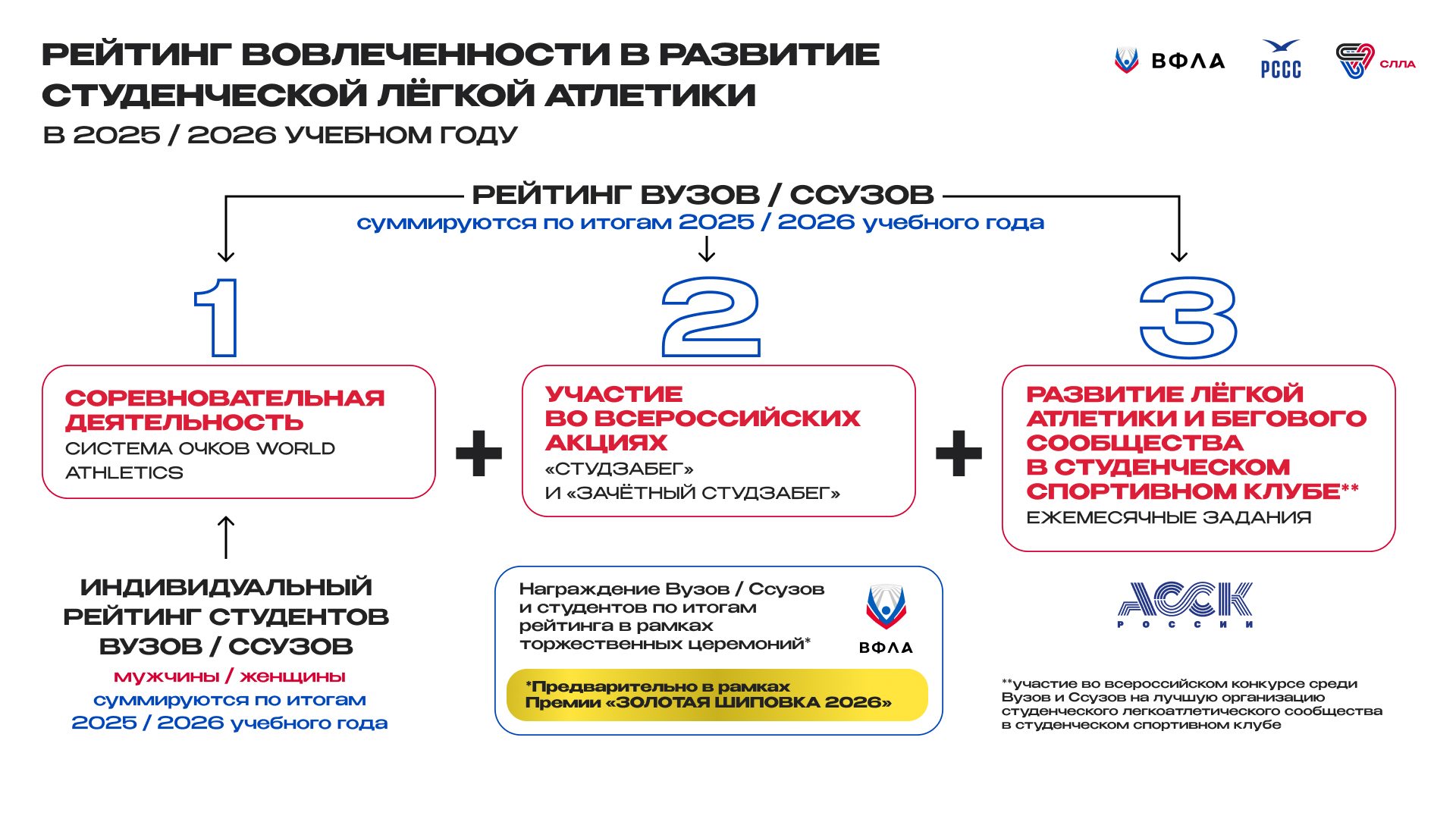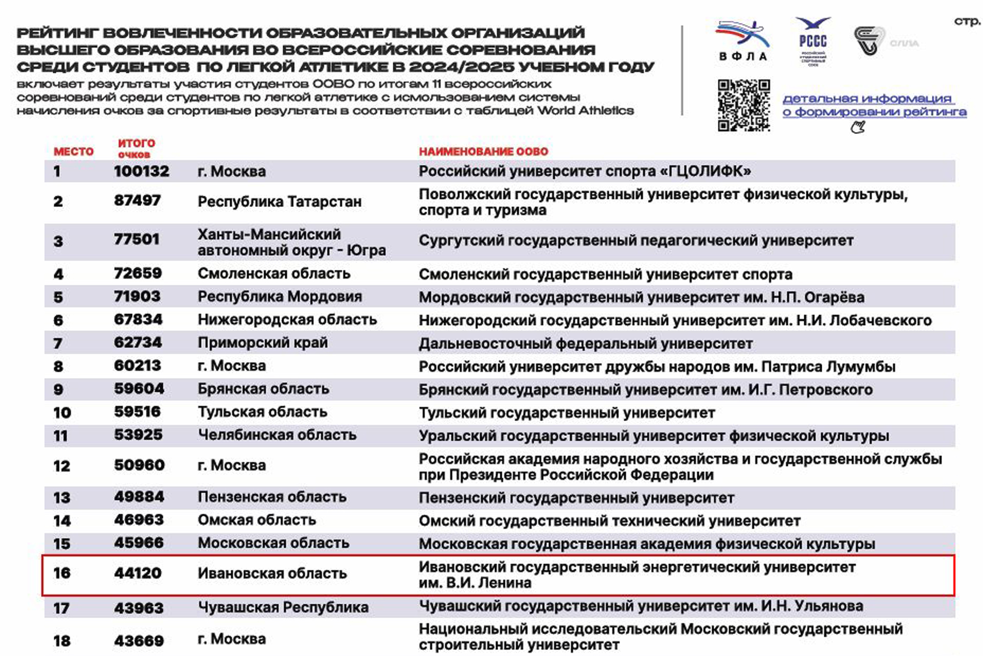 Ассоциация «Студенческая лига легкой атлетики» опубликовала рейтинг вовлеченности образовательных организаций высшего образования во всероссийские студенческие соревнования по легкой атлетике в 2024/2025 учебном году.