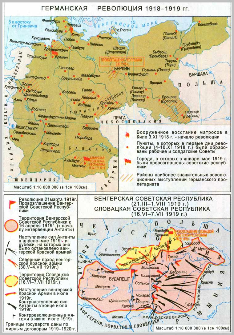 Германская революция 1918 1919 гг. Венгерские советская республика. Словацкая советская республика. 1919 г. // Новейшая история. Атлас. / Гл. ред. Г.В. Поздняк. Федеральная служба геодезии и картографии России. М., 2004. С.6.
